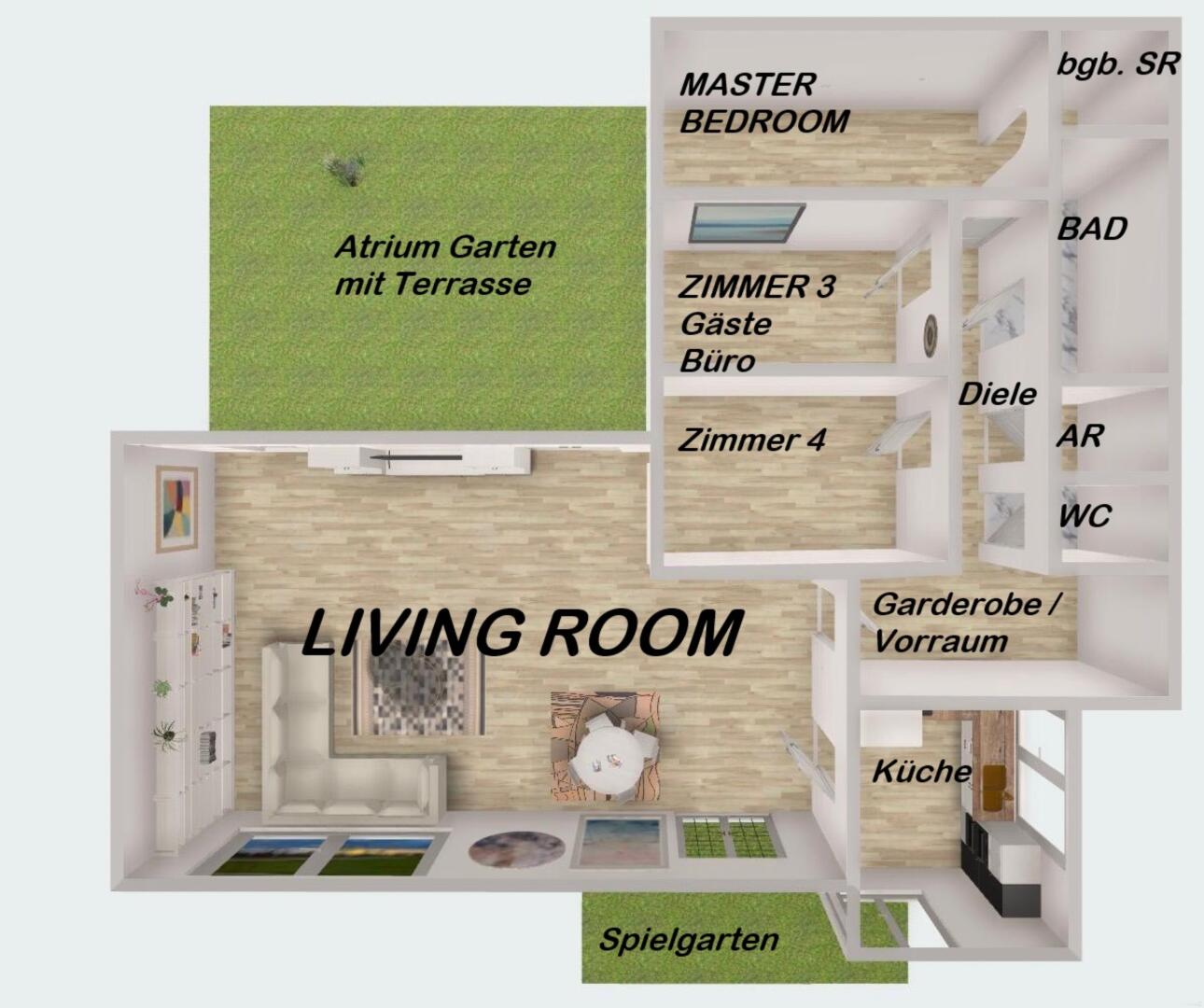 Außenflächen: Atrium ? Garten ca. 48,40m² Spielgarten ca. 16,49m² gesamt 64,89m²