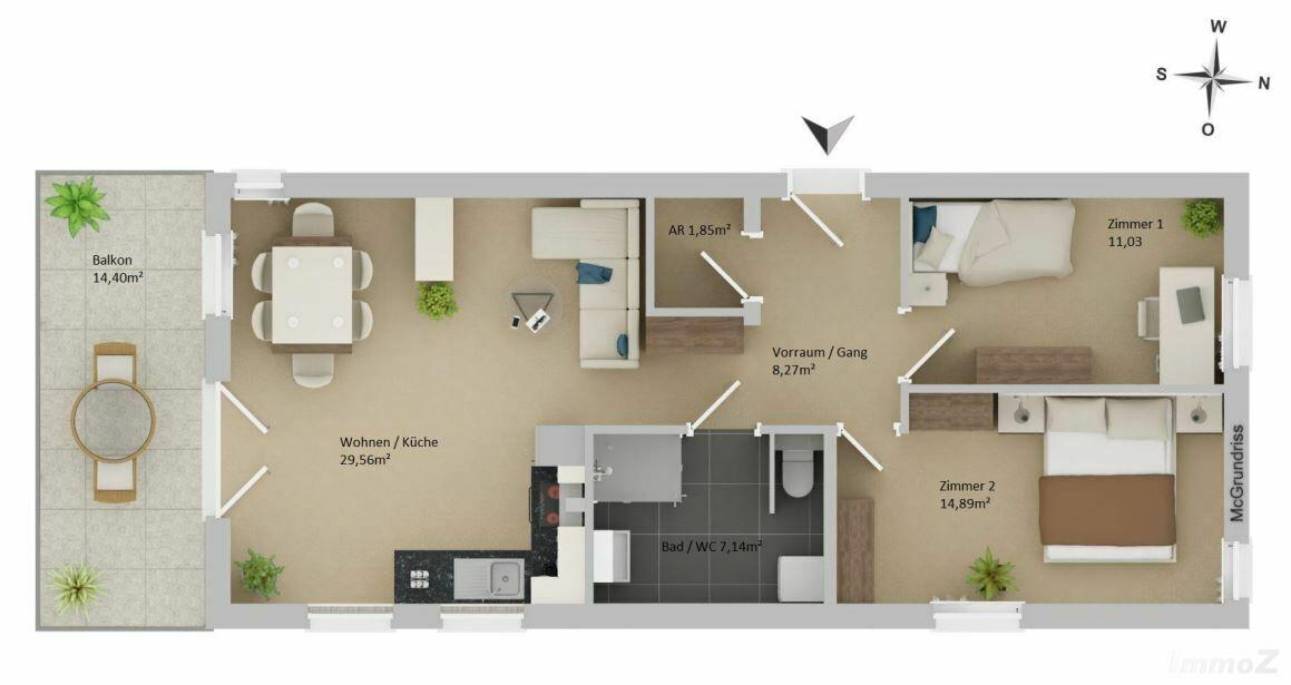Im Mittelpunkt steht der großzügige Wohn-Essbereich mit rund 29,56?m², der nicht nur Platz für Kochen und Entspannen bietet, sondern auch direkten Zugang auf den ca. 14,40?m² großen Balkon schafft ? ein Lieblingsplatz für Frühstück im Freien, entspannte Abende oder sonnige Lesestunden.
