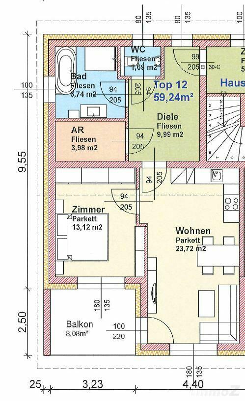 Die Wohnung besteht aus einer Wohnküche,einem Schlafzimmer, einem Badezimmer mit Wanne und Waschmaschinenanschluss, einem WC, einem Vorraum sowie einem Abstellraum.