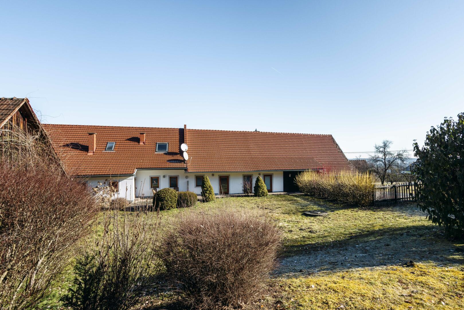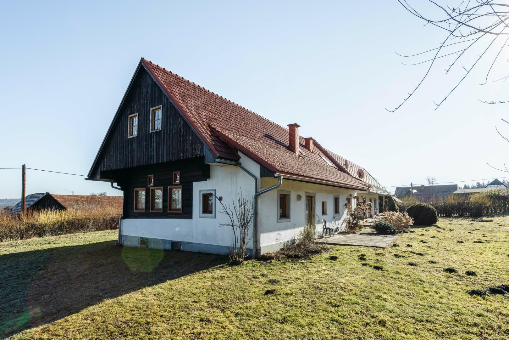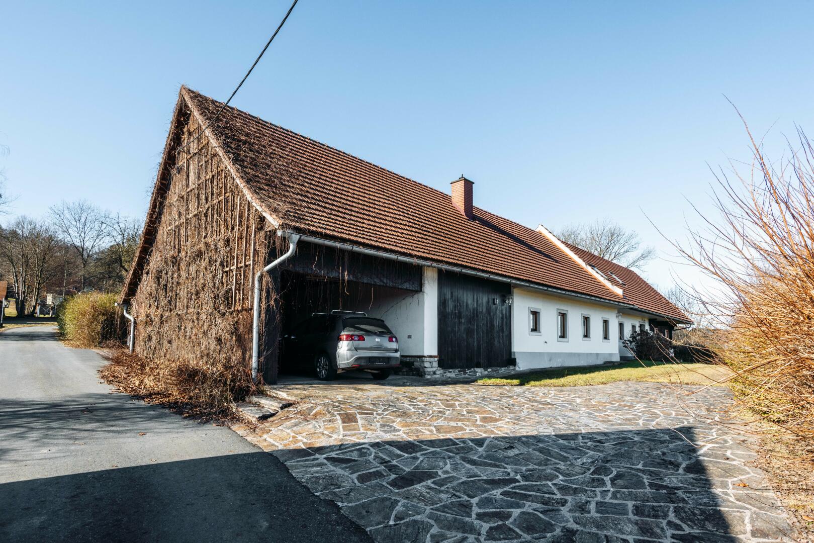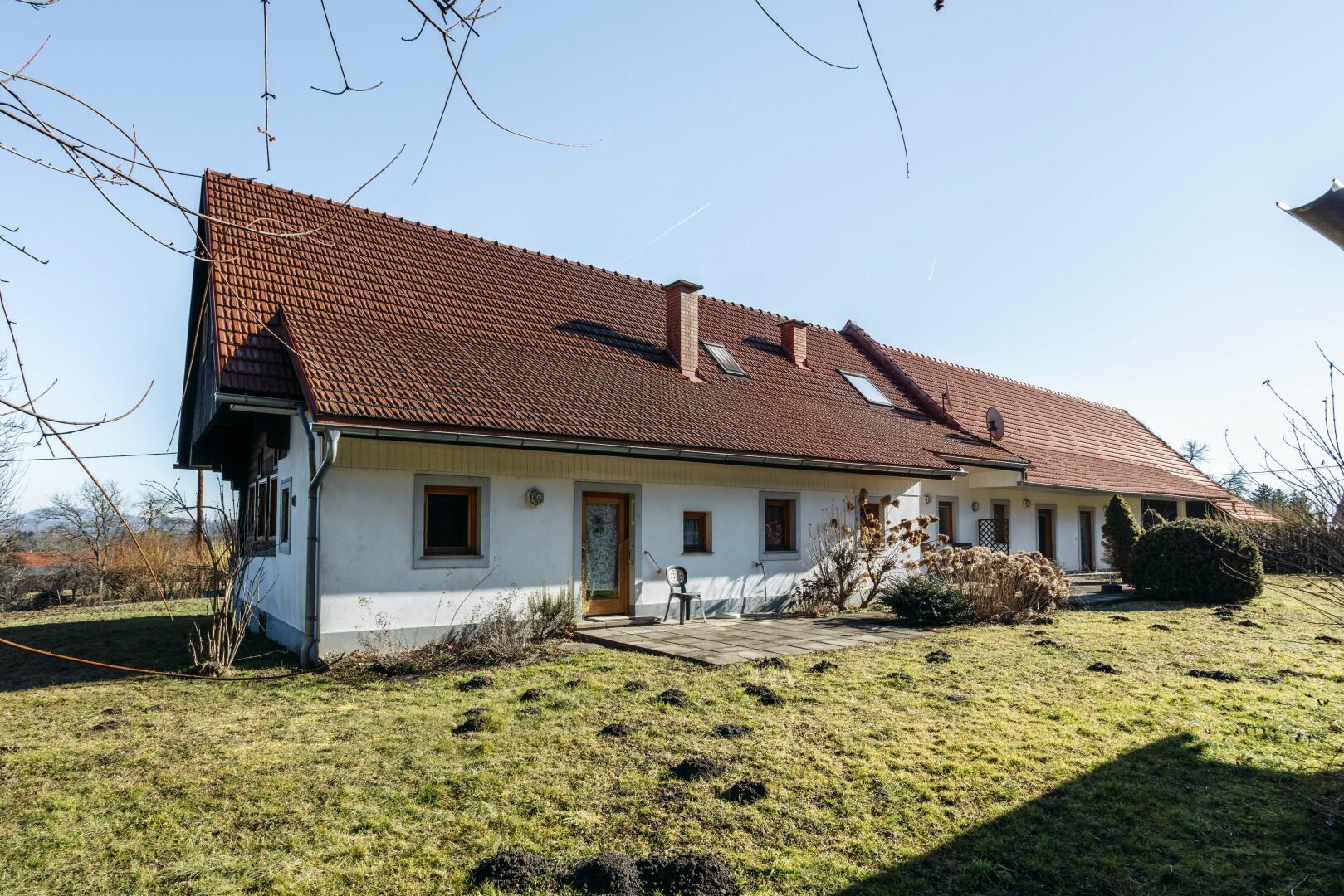 Das Haus mit ca. 170m² Wohnfläche besteht aus 2 vollständigen Einheiten, kann jedoch auch als Einzelnutzer verwendet werden. Angebaut an das Haus ist ein Wirtschaftsgebäude mit Carport für 2 Autos. Weiters befinden sich auf dem ca. 4950m² großen Grundstück noch 2 Holzschuppen, perfekt zum Lagern.