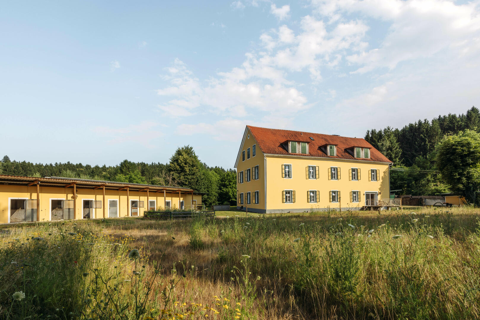 Als besonderes Zusatzangebot steht ein gepflegter Reitstall mit Reitplatz (20 × 40?m), zehn großzügigen Pferdeboxen, Waschplatz, Werkstatt und Lagerräumen zur Verfügung. Ideal für Pferdeliebhaber:innen, therapeutische Nutzung oder kleine Reitbetriebe - optional und flexibel in das Gesamtkonzept integrierbar.